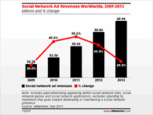 В прошлом году доходы соцсетей от рекламы выросли 50%, а в этом году увеличатся еще на 55,6%. В 2012 году этот рост замедлится до 45%, а к 2013 году - до 25,2%.