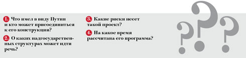 Сергей Алексашенко, профессор Высшей школы экономики 1–2. Интеграция — это тренд, который существует в современном мире, и здесь Россия вписывается в мировые тенденции. Единственное, что напрягает, — все участники специфичны с точки зрения режимов. Не очень понятно, что от этого могут выиграть российские компании. Казахские и белорусские будут выигрывать больше. Но Путин видит Евразийский союз и как некое экономико-политическое образование. Видимо, он хочет войти в историю как собиратель земель. Сильно сомневаюсь, что кто-либо из лидеров этих стран согласится отдать хоть какую-то часть своих политических полномочий наднациональному органу. Как политическое образование Евразийский союз — сомнительный проект. Украина уже смотрит в сторону Европы. Молдова и Грузия — тоже. Армения, Азербайджан, Туркмения, Узбекистан, Таджикистан, Киргизия — вот перечень потенциальных кандидатов.