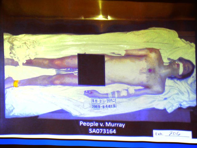 Фотография была показана в качестве улики во время выступления свидетеля обвинения - патологоанатома Кристфера Роджерса, производившего вскрытие. Медик объяснил присяжным, что Джексон находился в неплохой для своих 50 лет физической форме, однако на его теле были заметны следы от многочисленных инъекций, рассказывает The Daily Mail. Его сердце показалось патологоанатому здоровым.