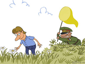lov Иллюстрация: Сергей Елкин - Минобороны в очередной раз вынуждено успокаивать общественность. Повестки аспирантам, выясняется, вовсе не означает, что их хотели призвать в армию. Проблема в том, что военным граждане, особенно образованные, не верят, армию не уважают и боятся. И сами военные этот образ только поддерживают.