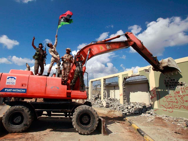 Новые ливийские власти приступили в воскресенье к сносу резиденции Муаммара Каддафи - укрепленного комплекса в Баб-эль-Азизии, одном из районов Триполи. Как сообщает ИТАР-ТАСС со ссылкой на Reuters, вооруженные противники свергнутого лидера, контролирующие столицу Ливии, прибыли на двух бульдозерах и начали сносить стены, окружающие резиденцию Каддафи. Одновременно они скандировали: "Аллах велик! Это расплата за кровь мучеников!" При этом некоторые из них стреляли в воздух из автоматов.