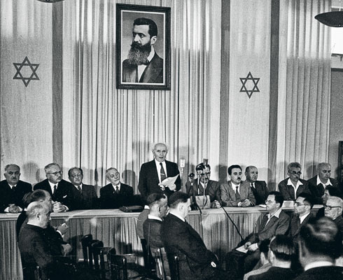 Буквально за несколько часов до окончания британского мандата в Палестине, 14 мая 1948 года в Тель-Авивском музее прозвучала Декларация независимости Государства Израиль — сбылась мечта многих поколений разбросанных по всему свету евреев. Этот исторический документ ровным, безо всяких эмоций голосом читал Бен-Гурион, взявший на себя роль главы Временного правительства и министра обороны. «Решение о провозглашении государства в тех условиях было принято исключительно благодаря Бен-Гуриону, — много лет спустя писал командовавший в то время вооруженными силами Израиля Игаэль Ядин. — Решение это по своей важности и значению превосходит тысячи политических решений и действий».