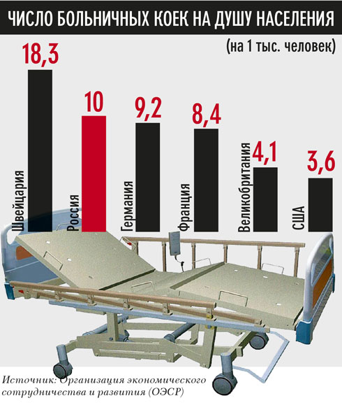 ” Мы же в России по-прежнему вкладываемся в «стены». Наша страна — один из мировых лидеров по числу больничных коек на душу населения, примерно 10 койко-мест на 1 тыс. человек. При этом качество медобслуживания в России Всемирная организация здравоохранения (ВОЗ) признает одним из худших в мире: по этому показателю наша страна занимает 130-е место из 190, находясь между Перу и Гондурасом.