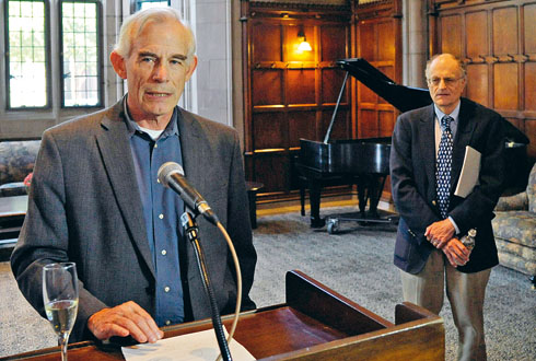 Кристофер Симс (на переднем плане) и Томас Сарджент на неформальном чествовании среди коллег в Принстоне 10 октября 2011 года