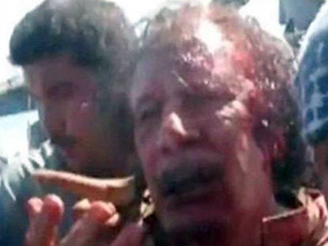 Кадры с мобильного телефона, предоставленные изданию Global Post 21-летним Али Альгали, показывают, как схваченного Каддафи моментально окружила толпа. Люди с криками "Аллах акбар!" принялись стрелять в воздух и тыкать в полковника автоматами. Каддафи c залитым кровью лицом несколько раз падал на колени, но его поднимали на ноги. Затем раненого усадили на капот автомобиля.