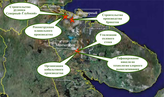 Среди них: строительство участка брикетирования медно-никелевого концентрата; реконструкция плавильного производства; строительство станции очистки шахтных вод рудника «Северный»; модернизация никеле- и меде-рафинировочного производства; утилизация солевого стока никелевого рафинирования пл. Мончегорск. Одновременно в районах размещения производственных мощностей ведется работа по рекультивации земель. В общей сложности за период с 2008 по 2010 год включительно инвестиции Компании в природоохранные мероприятия составили 1,78 млрд. рублей.