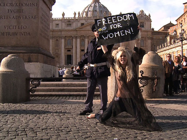 В Ватикан украинки явились в полупрозрачных накидках, имитирующих одеяние монахинь. Миновать преграды смогла лишь Александра Шевченко - она устроила топлес-акцию под балконом Папы Римского, развернув плакат с надписью "Свободу женщинам".