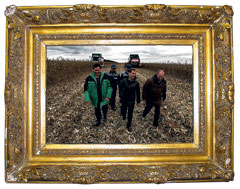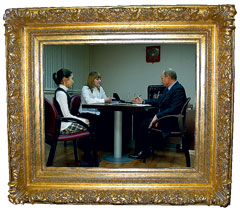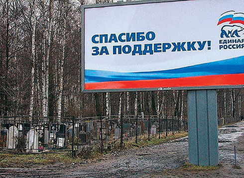 У парадного подъезда. В штабе московской «Единой России» каждый миллиметр покрыт логотипами партии: и маленькими, с визитку, и огромными, в целую стену. От изобилия рябит в глазах, в воздухе неприятный запах, идет ремонт, столики завалены буклетами и листовками. Всюду висят портреты: Владимир Путин на посевной, Владимир Путин и народ, Владимир Путин смотрит вдаль. В жизнь премьерских приемных окунулся The New Times