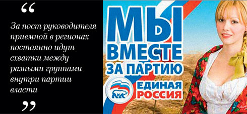 Статусное место Руководство приемной Путина — это ступень в неформальной партийной табели о рангах. Руководитель приемной — «надпартийной структуры» — в обход местного политсовета и других партийных инстанций имеет прямой выход на руководство «Единой России» в Москве, а что еще важнее — на аппарат главы правительства. Если премьер приезжает в регион, то обязательно заезжает в свою приемную, где его опять же встречает ее руководитель. В мае, когда было объявлено о создании Общероссийского народного фронта, статусность и известная ресурсность места выросла еще больше: премьер объявил тогда, что координаторами ОНФ в регионах станут руководители его приемных. Они же собирали с населения и готовили для аппарата правительства предложения при работе над так называемой «Народной программой», утвержденной сентябрьским съездом партии. Доступ к лицу № 1 дорогого стоил и в советские годы, и сейчас, потому за пост руководителя приемной в регионах постоянно идут схватки между разными группами внутри партии власти. Естественно, в предвыборный период эта война обостряется.