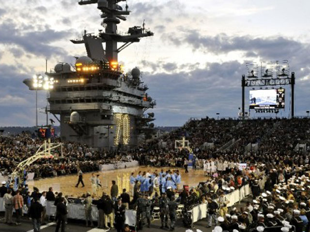 Встреча проходила не в зале одной из команд, а была проведена на военном авианосце "Карл Винсон". Площадку разместили прямо на взлетной полосе под открытым небом. Вокруг паркета были возведены трибуны, вместившие 8000 человек, в числе которых были Меджик Джонсон, Винс Картер, Памела Андерсон и Барак Обама.