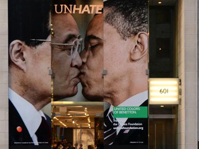 Компания Benetton вынуждена пожертвовать вторым принтом из своей скандальной рекламной компании: вслед за целующимся Папой Римским в США под удар цензуры попали плакаты с фотомонтажем, где президент страны Барак Обама целуется с китайским лидером Ху Цзиньтао.