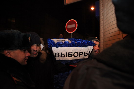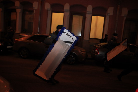 Полиция настигла маленькую процессию, когда та заворачивала в большой Черкасский переулок – там находится Центризбирком. Несколько человек несли гроб с надписью «выборы». Дойти до дверей ЦИКа своими ногами полиция им не позволила – участников несостоявшегося пикета несли или тащили туда, где напротив входа в здание стоял полицейский автобус. Те требовали полицейских представиться и предъявить документы - безрезультатно.