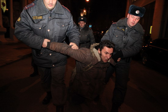 Среди задержанных оказались активисты «Левого фронта» и «Солидарности»: Олег Прудников, Андрей Духонин и еще два активиста. Андрея Грекова полицейские схватили, когда он давал комментарии прессе. Вера Лаврешина повесила на шею плакат «Пора менять власть» и кричала полиции «Позор!». Ее увели, не обращая внимания на то, что она ходит с тростью.