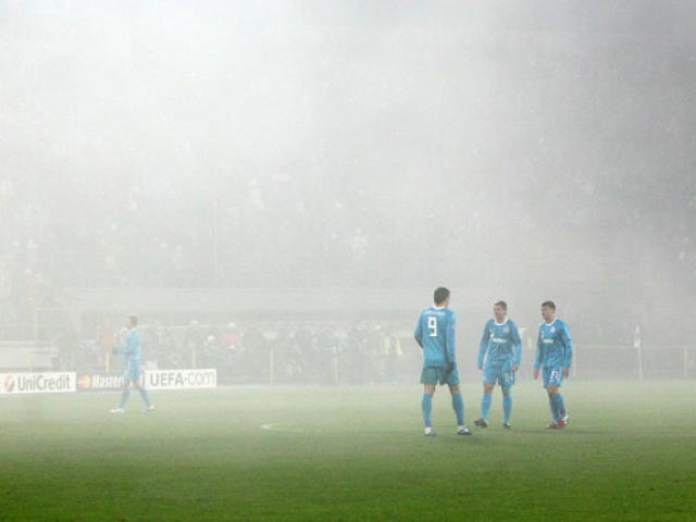 Встреча группы G на стадионе "Петровский", дважды прерывавшаяся из-за задымления от пиротехники, завершилась вничью 0:0. Главный арбитр Феликс Брих останавливал игру в каждом из таймов из-за буйного поведения зрителей на фанатском вираже "Петровского". Там несколько раз по ходу матча зажигали файеры, едкий дым заволакивал поле. Какие санкции УЕФА применит к "Зениту" за поведение его болельщиков, пока неизвестно.