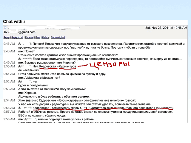 Журналист назвал и фамилии людей, которые просили его об "убирании" политических текстов. По его словам, это начальник отдела выпуска интернет-проектов РИА "Новости" Ирина Кедровская и заместитель генерального директора РИА "Новости" Леонид Бурмистров.