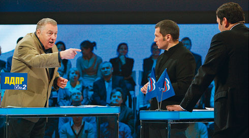 Силу и необратимость прямого эфира в эти дни ощутили на себе многие, попавшие в телевизор, в формат политических дебатов. Где еще можно было услышать потрясающий слоган, вырвавшийся из уст Александра Хинштейна: «Лучше быть в партии жуликов и воров, чем в партии убийц и насильников!» Владимир Жириновский, кому предназначалась эта реплика, тоже пару раз вылетал «за флажки» на радость зрителям канала «Россия 1»: «КПСС было говно, а «Единая Россия» — трижды говно!» Есть еще более неприличные цитаты, которые надолго останутся в памяти у очевидцев этого прямого эфира. Собственно, подобная стилистика ведения дискуссии мало чем отличается от быдло-шоу «Пусть говорят» и приближающегося к нему кривого «Прямого эфира». Поэтому выступление Григория Явлинского в шоу Владимира Соловьева явно выбивалось из общего ряда непристойностей и взаимных оскорблений. Явлинский продемонстрировал блестящую интеллектуальную полемическую форму — говорил ярко, аргументированно, умно, без заискивания перед простым народом, без привычных демагогических приемов. Он был абсолютно свободен, не старался никому угодить, и это забытое ощущение личной правоты и личной убежденности производило впечатление.