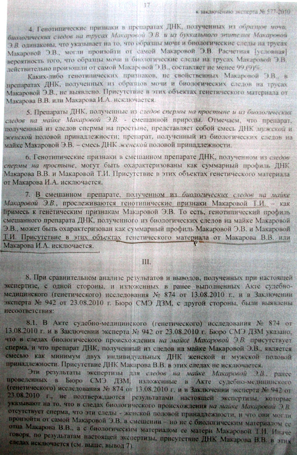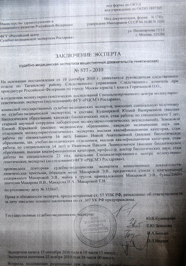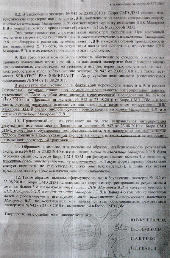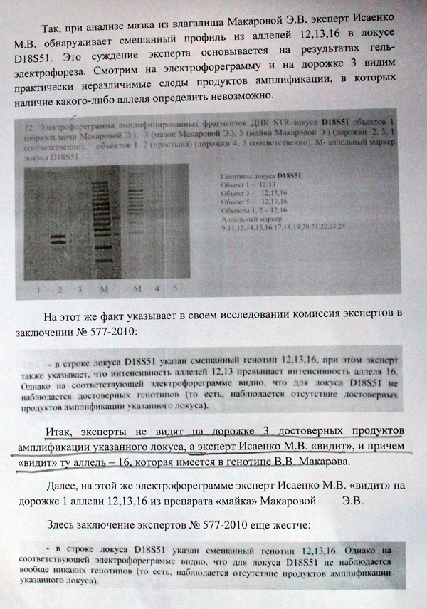 С Соколовой и Нестеренко понятно. Теперь главным аргументом в пользу версии о виновности Макарова остается заключение эксперта Исаенко №942 от 23.08.2010. Однако к точности интерпретации результатов молекулярно-генеической экспертизы, проведенной Исаенко М.В, у многих уважаемых экспертов есть большие сомнения. Вот, например, отрывки из заключения специалиста в области молекулярной генетики Сергея Хальчицкого:
