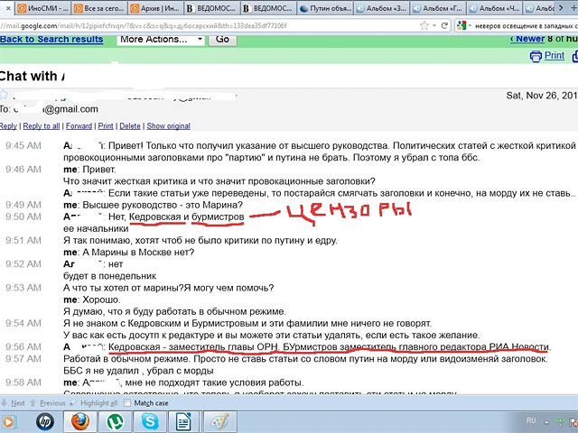 Поскольку главный редактор "ИноСми" Марина Пустильник в это время находилась в отпуске, то координацией интернет-проектов РИА "Новости" занималась первый заместитель руководителя Объединенной редакции новостей РИА Ирина Кедровская. Она следила за содержанием переводных материалов, которые могли бы содержать элементы политагитации. В СМИ других стран к ним неприменимы нормы российского избирательного законодательства, а в России ответственность за нарушение легла бы на РИА "Новости" - как владельца ресурса, где трудился оскандалившийся редактор.