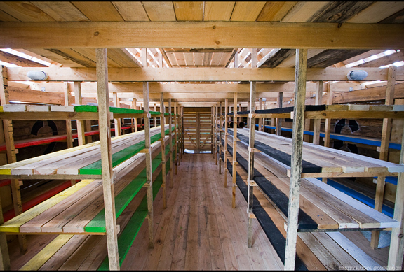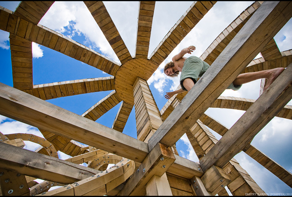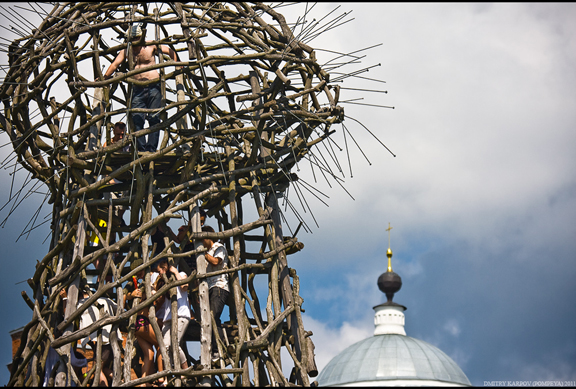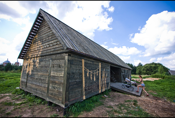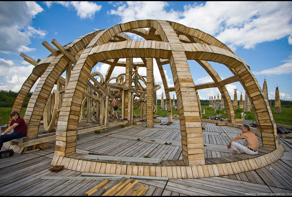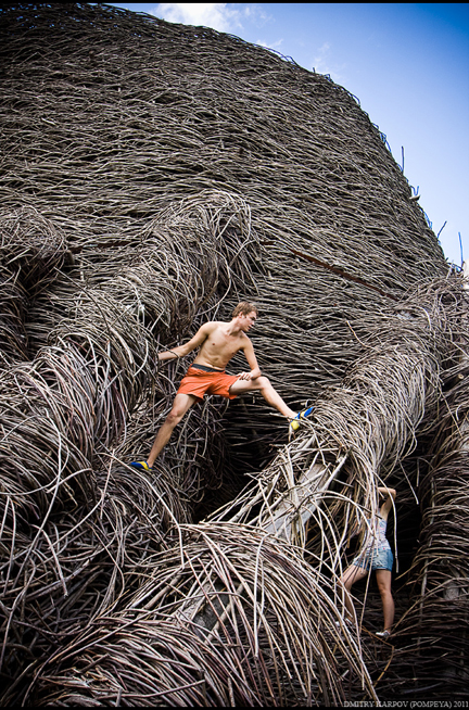 Сарай сараев Набор наших обращений имитирует спонтанную речь: куда можно сходить? как вам это? что это такое? понравилось? Чаще всего разговоры не продолжаются более двух-трех минут, но возникают и исключения, когда уставшие фланеры задерживаются на каком-то из объектов. Особенно к этому располагали «Павильон шишек», «Маяк» и «Сарай сараев». Располагали по разным основаниям. В первом, оказавшись в замкнутом пространстве, огороженном приплюснутыми к деревянным стенам шишками, хотелось предаться размышлениям. Во-втором, забравшись на верхатуру по шатким, местами надломленным веточкам-ступенькам, надо было перевести дыхание, побыть там (а иначе зачем же подниматься). В-третьем, добротный стол, ряды полок для хранения, лавки на втором этаже подталкивали к хозяйственным размышлениям. Посетители, как бы, примеряли увиденное к собственным дачным или огородным нуждам. Однако, оставив в стороне исключения, можно увидеть, насколько динамично перемещаются люди. Никто не задерживается на объектах. Щелкают затворами фотоаппаратов, обмениваются несколькими репликами и спешат дальше: