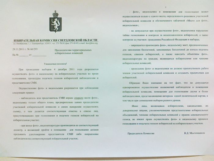 Станислав Жарков, член УИК с правом решающего голоса от партии "Яблоко", поделился очень любопытным документом, подписанным главой Избирательной комиссии Свердловской области Мостовщиковым. Суть бумажки сводится к следующему: фото-видеосъёмка будет практически запрещена на избирательных участках в день голосования. Отдельные пункты просто прямо противоречат действующему законодательству.