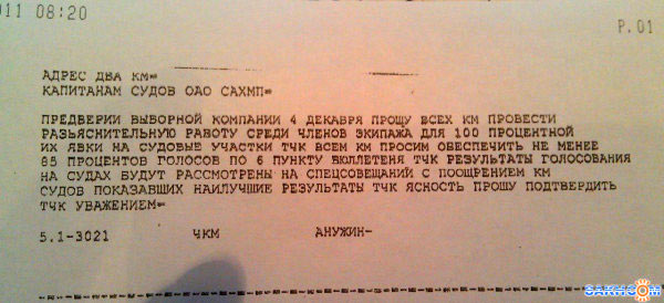 Мы сами в лёгком шоке, но автор телефонограммы об обязательном голосовании моряков и 85% за "Единую Россию" подтвердил подлинность этого замечательного документа. Подробности - в новостях "Эха Москвы".