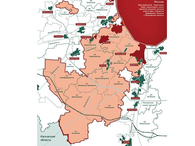 Напомним, в июне Дмитрий Медведев выступил с инициативой о создании "столичного федерального округа" путем расширения границ Москвы и присоединения к 160 тысяч гектаров земель юго-запада Подмосковья. Соглашение предусматривает включение в состав столицы 21 муниципального образования, в том числе двух городских округов, 19 городских и сельских поселений на юго-западном направлении, а также трех незаселенных участков территории к западу от Москвы. На юго-западе город будет граничить с Калужской областью. в августе была опубликована на официальном сайте городского правительства.