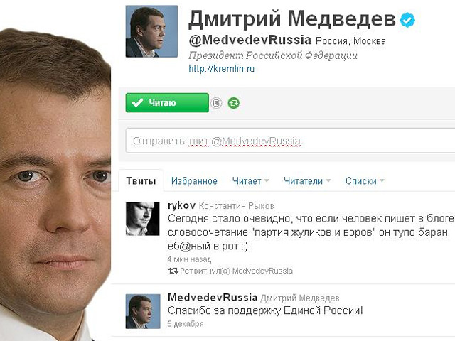 Напомним, минувшей ночью на странице президента в Twitter вслед за благодарственной надписью в адрес сторонников "Единой России" появился твит следующего содержания: "Сегодня стало очевидно, что если человек пишет в блоге словосочетание "партия жуликов и воров" он тупо баран е**ный в рот :)". Этот ретвит записи из микроблога Рыкова провисел всего несколько минут и был стерт.