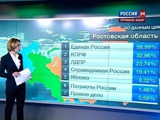 Напомним, блоггеры сохранили телекадр с данными по Ростовской области. Согласно выведенным в эфир "России-24" показателям, у "Единой России" набралось 58,99%, у КПРФ - 32,96%, у "Справедливой России" - 23,74%, ЛДПР - 19,41%, а у "Яблока" - 9,32% голосов. Если сложить проценты, получается всего 146,47%. Озвучивали данные вслух молодые ведущие.