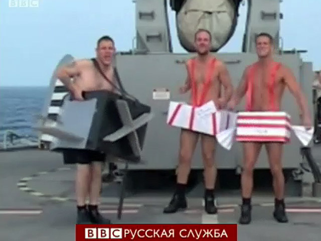 Моряки с обнаженными торсами позируют на палубе, в койке, на кухне под елкой в мишуре. Романтичный паренек задумчиво лежит на фоне моря, а его мускулистый сослуживец уже схватил доску для серфинга. Кто-то в штанах цвета хаки и в верхе от желтого бикини, кто-то закутан в британский флаг. Отжимаются подле вертолета, сидят в ванне с пеной и шампанским.