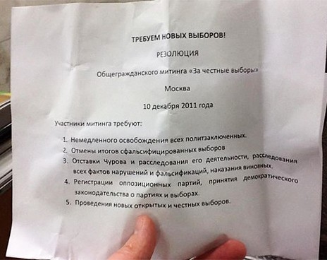 Сегодня на Болотной площади состоялся митинг против нечестный выборов. По разным оценкам митинг посетили от 60 000 до 100 000 человек. По его итогам организаторами митинга была принята резолюция из 5 пунктов. В резолюции они требуют: отставки главы ЦИК Владимира Чурова, признания результатов выборов недействительными, расследования нарушений, проведения повторного голосования и освобождения политзаключенных. Slon приводит фотографию резолюции.
