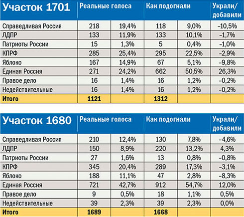 Алиса Иваницкая 4 декабря наблюдала за ходом голосования на участке № 114, открытом в московской школе № 1379 на Земляном Валу. Голосование шло честно, вбросов наблюдатели не зафиксировали, после закрытия участка и подсчета голосов выяснилось, что «Единая Россия» заняла 2-е место с 389 голосами. Лидировала по этому участку КПРФ — 403 голоса, прилично набирали «Яблоко» и «Справедливая Россия» — 320 и 222 голоса соответственно. Председатель УИКа Нона Шеншина результаты зафиксировала, позвонила кому-то по телефону и отчиталась, что протоколы скоро будут доставлены в ТИК. Однако неизвестного собеседника Шеншиной эти данные не устроили, и глава участка прямо на месте переписала протокол: «Единая Россия» заняла 1-е место, «получив» аж 675 голосов, результат коммунистов также улучшился на несколько голосов, а эсеры и «яблочники» потеряли по 100 голосов. К изумлению Иваницкой, никто из членов комиссии не сказал ни слова, а сама она даже формально не имела права что-либо возразить. Такой способ фальсификации для Москвы нетипичен — в подавляющем большинстве случаев изменения в протоколы, составленные на участках, вносились уже в территориальных избиркомах, перед отправкой цифр в ГАС*> «Выборы». Чтобы понять, сколь важную роль сыграли ТИКи в победе «Единой России», достаточно двух цифр: если по Москве в целом ЕР набрала 46,6%, то на участках, оборудованных КОИБами***Государственная автоматизированная система.