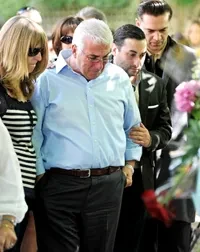 Митч Уайнхаус, брат Эми Алекс Уайнхаус и ее друг Рэг Тревисс у цветов, оставленных поклонниками певицы у ее дома