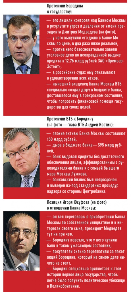 «Мне сказали: бери сколько дают, а то устроим проблемы». Скандал вокруг Банка Москвы не утихает. В центре его — обвинения экс-руководителя банка Андрея Бородина в адрес президента Медведева в том, что тот имел собственный интерес в операции по отъему банка у прежних владельцев. Все это время The New Times следил за развитием событий. Одновременно мы направили просьбу об интервью самому банкиру. Ответы на вопросы были получены редакцией в электронном виде