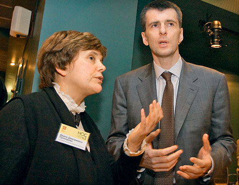 Этот «комбинаторный ум» с лихвой проявился и позже. «На нашем курсе (в Финансовом институте) было много людей, которые впоследствии сделали блестящую карьеру», — рассказывает журналист Ольга Романова. Кроме уже упомянутого Хлопонина однокурсником Прохорова был и Андрей Козлов, в будущем первый зампред ЦБ, убитый в 2006 году. «У них с Прохоровым была общая компания, — вспоминает Романова. — Козлов выделялся умом, Хлопонин — остроумием, а Прохоров — ростом». Бизнес на вареных джинсах позволил Прохорову еще студентом стать обладателем собственной «Лады», что тогда было редкостью. «У него в машине под сиденьем были приделаны салазки, чтобы можно было отодвигаться, — вспоминает Романова. — Прохоров очень обижался, если из-за этого над ним подтрунивали». По словам Романовой, несмотря на выдающуюся внешность и хороший заработок, девушкам Прохоров в то время много внимания не уделял: «Я вообще не помню, чтобы он хоть с кем-то встречался, — говорит Романова. — Все знали, что он был влюблен в красавицу Елену Мысеву, но она на последнем курсе вышла замуж за постового милиционера по фамилии Барбашев. Потом, когда Прохоров уже стал богатым и влиятельным человеком, он взял ее на работу в их с Потаниным структуры, но, насколько известно, она и тогда на его чувства не ответила». В группе ОНЭКСИМ у Прохорова Елена Барбашева работает до сих пор.
