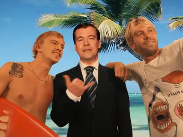 Подложный "Медведев" охотно фотографируется с двумя молодыми ребятами и блондинкой в красном бикини, подыгрывает пляжным волейболистам и все это время продолжает произносить поздравительный новогодний текст. К своим обязанностям "президент" и в этом видео относится самым серьезным образом: отказывается от пива и не реагирует на голос за кадром: "Дим, ну хорош сопли жевать, пошли купаться".