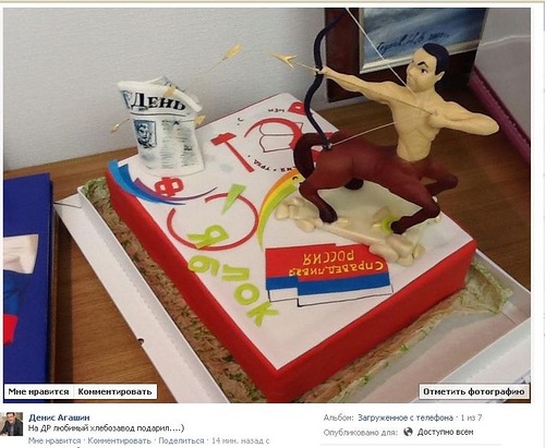 Глава ижевской администрации Денис Агашин, получивший всероссийскую известность в связи с роликом, выложенным в октябре в Ютьюбе, где он сулит ветеранам сотни тысяч за высокий процент голосования за ЕдРо, 8 декабря отметил своё 36-летие. На день рождения господин Агашин получил торт от принадлежащего ему хлебозавода № 3 – на торте высится фигура кентавра, лицом похожего на Дениса Владимировича. Кентавр копытами попирает разбросанную по поверхности кондитерского изделия символику оппозиционных партий – Справедливой России, КПРФ, Яблока. И на бегу мифический зверь пускает стрелы в стоящую торчком газету День, единственное независимое издание в Ижевске. Снимок с произведения сладкого искусства сити-менеджер Ижевска выложил в своём микроблоге в Твиттере. Этот факт комментирует Андрей Коновал, публицист "Дня" и гражданский активист