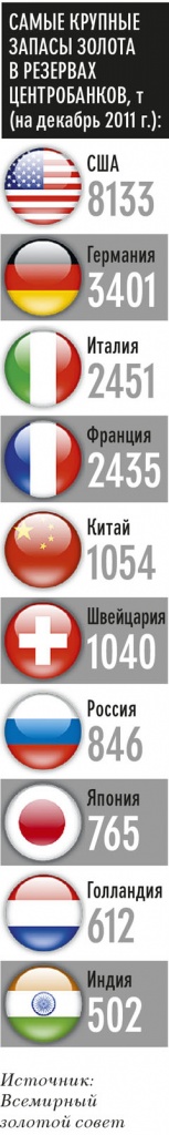 Столь ценное свойство драгметалла профессионалы заметили еще в начале года. Страхуясь от инфляции и удешевления доллара, центральные банки развивающихся стран (Мексики, Таиланда, Южной Кореи, Казахстана, России), не сговариваясь, стали спешно пополнять свой золотой запас. В лидерах этого процесса оказался российский Центробанк: в 2011 году он прикупил 90 т золота, в результате чего золотой запас страны достиг 846 т, а доля золота в международных резервах — 7,8 %. Не отстают и отечественные коммерческие банки: в 2011 году они закупили у добывающих компаний 137,74 т золота. Лидером по закупкам драгоценного металла стал Сбербанк: он приобрел 35,3 т.