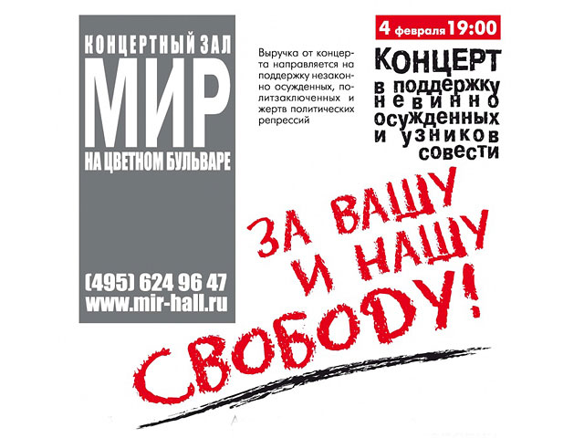 После мирного шествия "За честные выборы" 4 февраля в 19:00 в Москве в киноконцертном зале "Мир" состоится концерт "За вашу и нашу свободу" в поддержку невинно осужденных и узников совести. В нем примут участие бард Юлий Ким, лидер музыкальной группы "Несчастный случай" Алексей Кортнев, писатель-сатирик Виктор Шендерович, сообщается на сайте организаторов концерта, "Союза солидарности с политзаключенными".