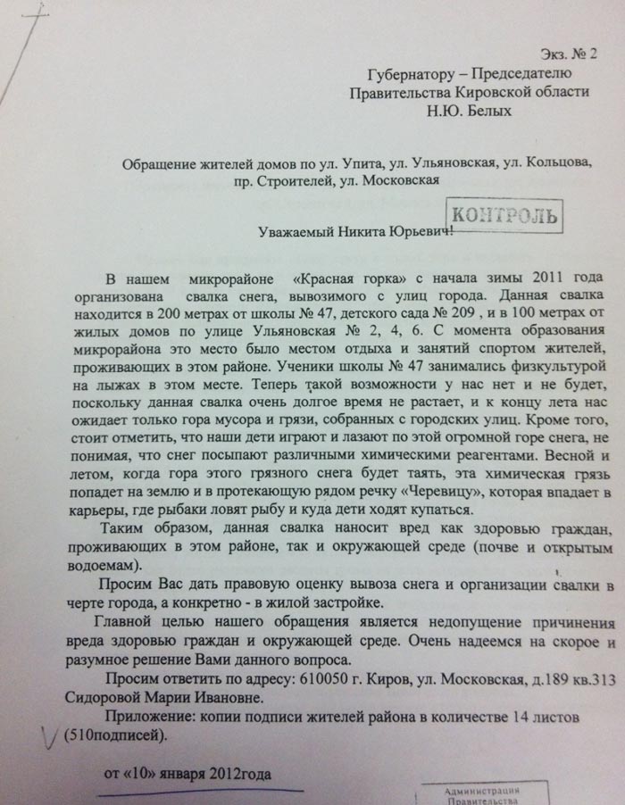 Было обращение ко мне по этой проблеме. Написано 10 января, поступило 11 января. Вот это письмо - как видите, никаких приглашений. Жители просят дать правовую оценку. Как только поступило – поручил провести проверку. 13 января уже взяли пробы снега.