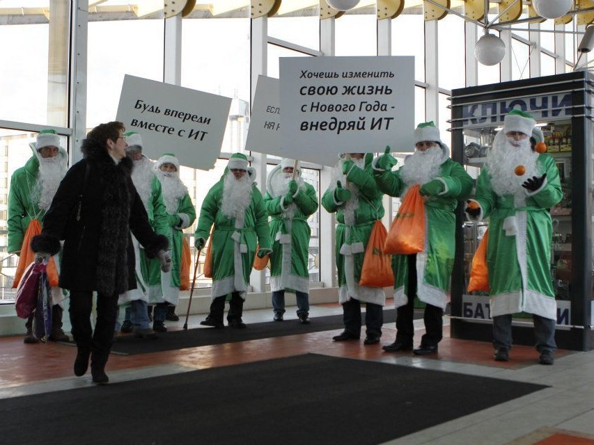 Деды Морозы активно привлекали внимание к теме информационных технологий для бизнеса. В руках у них были плакаты с лозунгами: «Хочешь изменить свою жизнь с Нового года – внедряй ИТ!»; «Будь впереди вместе с ИТ!»; «Если ты внедрил ИТ, конкуренты позади!».