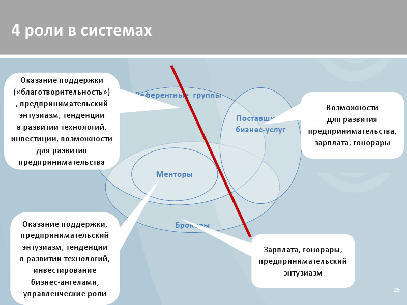 На пересечении этих 2 категорий – третья, менторы, которые оказывают поддержку в разных технологических областях. Наконец, четвертая роль – поставщики бизнес услуг, которые хотят заработать на этих стартапах. Мы быстро пришли к выводу, что необходимо 3-ю и 4-ю категории очень жестко развести по углам. Потому что с поставщиками бизнес-услуг вы обычно устраиваете договорные, контрактные отношения. А с менторами отношения должны быть очень доверительными, личными. Отношения с наставником не будут работать, если у вас есть ощущение, что он на вас хочет заработать. Именно поэтому во многих программах менторам запрещают инвестировать в стартап, который они консультируют.