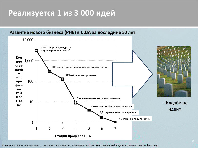 Эта кривая показывает, сколько нужно сгенерировать идей, чтобы добиться коммерческого успеха. Данные взяты из большого количества опросов, исследования проводились лабораториями и венчурными компаниями. Эта кривая показывает, что многие идеи заканчивают свою жизнь на кладбище прототипов. Реализация многих идей ведет исключительно к трате денег. Мы сталкиваемся с очень важным вопросом: как минимизировать затраты, если 299 из 300 в какой-то степени проработанных и потребовавших финансирования идей заканчивают свою жизнь на кладбище прототипов. Последняя цитата на эту тему: «Большинство компаний и стартапов терпят неудачу из-за того, что производят не тот продукт, который нужен, делают слишком медленно, тратят слишком много денег, и потом еще пытаются этот продукт продвигать».
