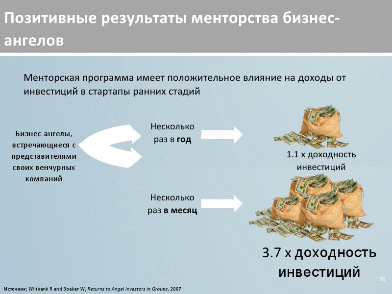 Здесь мы приводим данные по исследованиям менторства в США. Они показывают, что бизнес-ангелы встречаются со стартапами несколько раз в год, доходность инвестиций чуть превышает 1. Это средние данные, температура по больнице. Небольшая часть бизнес-ангелов зарабатывает огромные деньги, а большинство деньги теряет. А в рамках программы встречи проходят несколько раз в месяц. Это позволяет инвесторам зарабатывать гораздо больше денег.