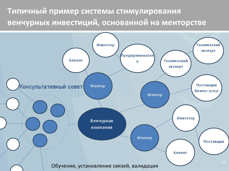 Доклад Жана-Луи Расина В октябре с участием Российской венчурной компании и Всемирного банка был проведен первый семинар, на котором обсуждалась тема поддержки инновационно-технологического предпринимательства. На нем обсуждалось проведенное по заказу РВК исследование Всемирного банка. Это исследование практик построения в мире структур и организаций, предназначенных для ускоренного экономического развития технологического предпринимательства, отметил во вступительном слове генеральный директор Российской венчурной компании Игорь Агамирзян. Для упрощения можно назвать это сетями инновационного предпринимательства, сетями инновацинного развития. Вопрос в том, как структурируются экосистемы, взаимоотношения между разными участниками инновационно технологического рынка в разных странах.