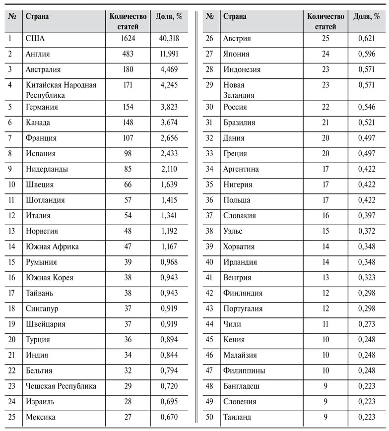 Несомненным лидером на международном рынке академических публикаций традиционно остается США: 1624 статьи из 4028 опубликованных в 2000-е годы, или 40%. Далее со значительным отрывом идут Англия – 483 статьи, или 12%, Австралия – 180 статей, или 5%, Китай – 171 статья, или 4%, Германия – 154 статьи, или 4% и Канада -148 статей, или 4% от общего количества публикаций за эти годы. Россия занимает лишь 30 место, с 22 публикациями. Конечно, эта цифра не отражает даже малой доли публикаций о коррупции на русском языке, а лишь указывает на те публикации, которые индексируются в международных базах, а значит становятся «видимыми» для иностранных коллег (табл. 1).