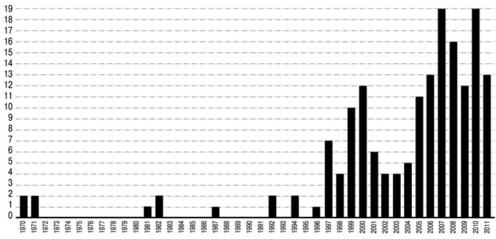 Рис. 1. Распределение по годам количества публикаций о коррупции (Web of Science, дата поиска: 12.11.2011)