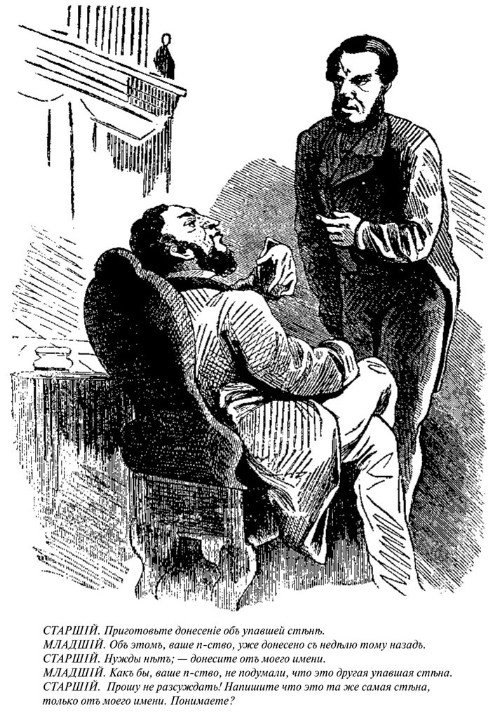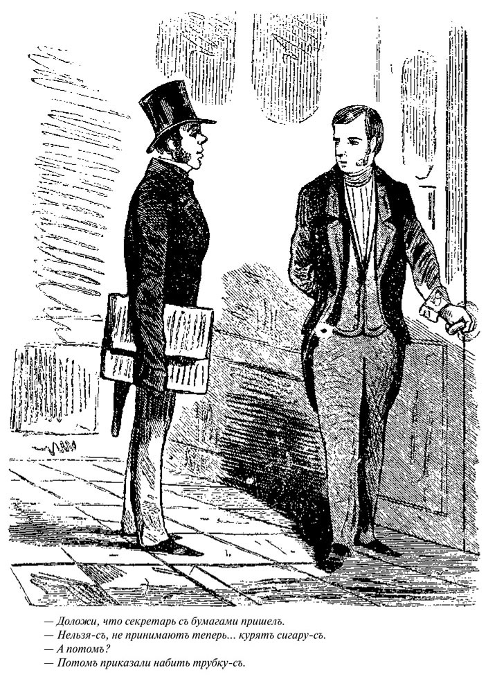Праздношатающийся (в раздумье). Чего он мне тут нагородил, ничего не поймешь!.. ба! мысль! (вынимает из кармана записную книжку и пишет) мошенничество… обман… взятки… невежество… тупоумие… общее безобразие!.. что выйдет, не знаем, а подадим горячо!