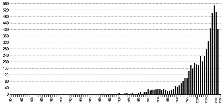Всего на тему коррупции по социальным базам данных Web of Science найдено 5 779 публикаций (дата поиска: 12.11.2011). Первое упоминание приходится на 1904 год. В нем, сопоставляя ситуацию в Великобритании и США, Джонс Генри Форд затронул вопрос о политической коррупции, наиболее ярко проявляющейся во время социальных трансформаций, когда вновь приходящие элиты сталкиваются с неприемлемыми для них практиками[1]. Далее, после небольшого оживления[2], в основном связанного с темой нелегального бизнеса и взяточничества в органах государственной власти в США, на протяжении нескольких десятилетий, с 1912[3] по 1949 год[4] не выходит ни одной статьи, которая бы индексировалась в ISI Web of Science. Наиболее заметным событием стал выход в свет в 1910 году монографии Роберта Брукса «Коррупция в американской политике и жизни»[5], на которую написано несколько обстоятельных рецензий[6]. Незначительный всплеск интереса к коррупционной тематике в начале 1950-х гг.[7] связан с публикацией монографии Г.Г. Вилсона «Конгресс: коррупция и компромисс»[8].