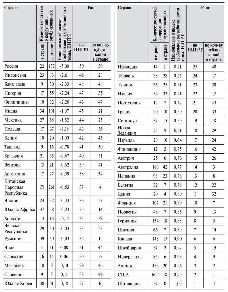 Индекс косвенно указывает на теоретическую разработанность темы коррупции в выбранной стране. Если количество публикаций о коррупции в этой стране минимально в зарубежных изданиях (реферируемых в ISI Web of Science), однако в национальных журналах (речь идет, разумеется, о выбранной базе данных) публикуется много статей о коррупции, то страна занимает лидирующее положение в производстве академического дискурса о коррупции. Страна не только концептуализирует тему, но и актуализирует ее в международном контексте (несомненные лидеры - США, Англия и Шотландия). Напротив, если тема коррупции не развита в стране (мало публикаций в национальных журналах), но в других странах выходит много публикаций о фактах коррупции, наблюдаемых на ее территории, это указывает на национальную неразработанность актуальной для этой страны темы. В первом случае, страна выступает теоретическим и методологическим центром изучения коррупции, во втором – объектом и предметом такого изучения. Из 50 наиболее активных в публикационном поле стран Россия занимает последний ранг по индексу национальной разработанности коррупции. То есть количество статей о коррупции, публикуемых внутри России, значительно меньше количества статей о российской коррупции, выходящих в свет в других странах (табл. 2).