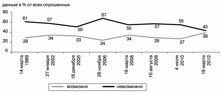 Отметим также, что очень радикально – сильнее, чем по стране в целом, – изменились ответы людей, имеющих высшее образование. В 2010 году, незадолго до экстремальной жары и пожаров, 26% обладателей вузовских дипломов верили, что коррупция в России может быть побеждена, а 62% – что искоренить ее невозможно. Холодная весна 2012-го фиксирует паритет мнений: 44% высокообразованных россиян верят, а 46% – не верят в это.